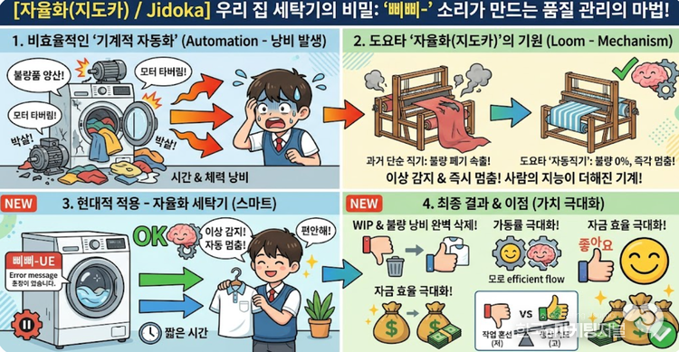 당장 빨래를 널고 외출해야 하는 사람 입장에서는 원망스럽기 짝이 없지만, 사실 이 멈춤 기능이야말로 세탁기를 지키고 당신의 옷감을 보호하는 위대한 기술이다. 경영학과 생산관리에서는 이를 단순한 기계적 자동화(Automation)와 구별하여, 사람의 지능이 더해진 '자율화(Jidoka, 지도카)'라고 부른다.